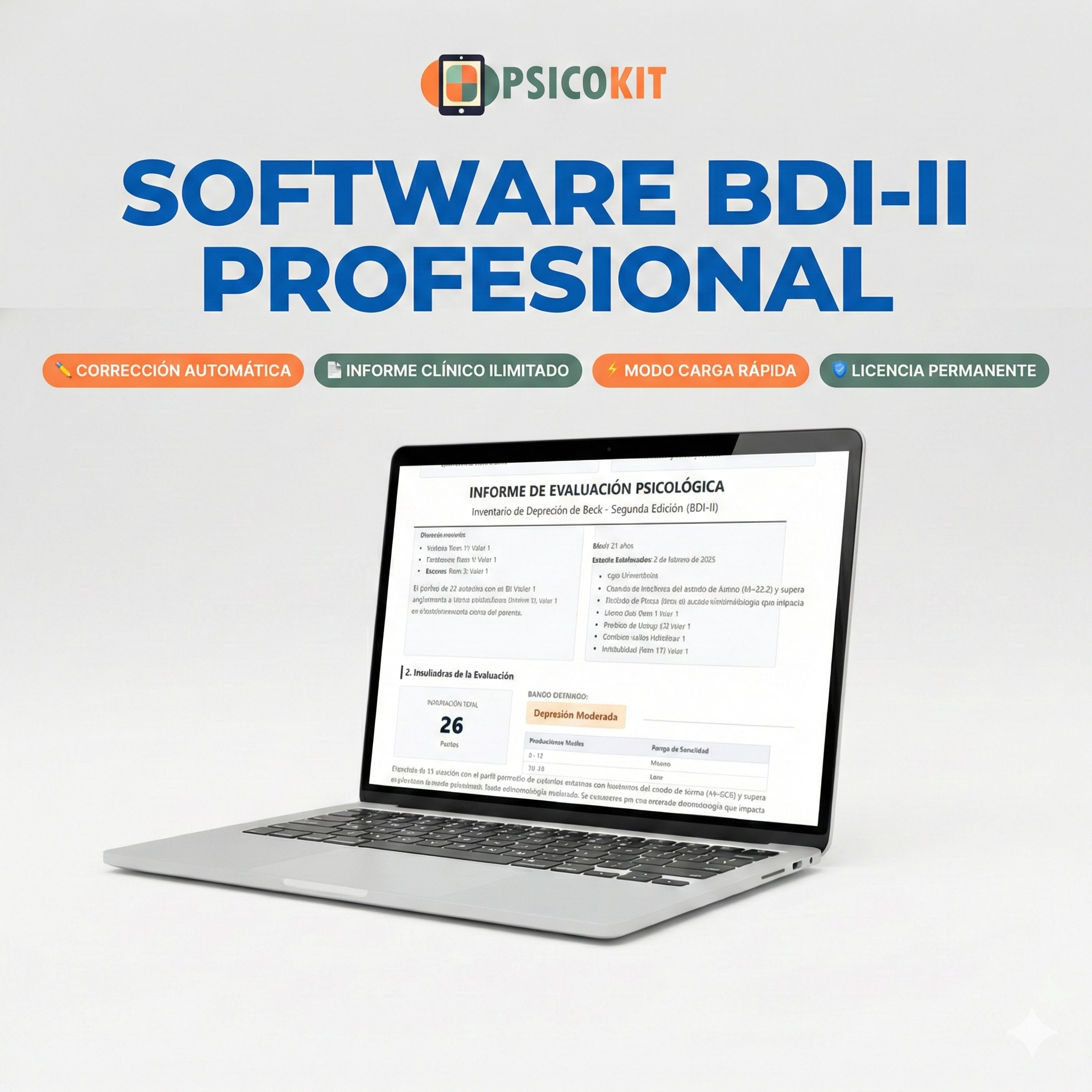 Olvídate de sumar puntajes manualmente. Este software profesional para el Inventario de Depresión de Beck (BDI-II) automatiza todo el proceso: desde la toma del test hasta la redacción del informe clínico. ✅ Corrección automática con baremos actualizados. ✅ Modo «Carga Rápida» para digitalizar tests en papel en segundos. ✅ 100% Privado: Los datos de tus…